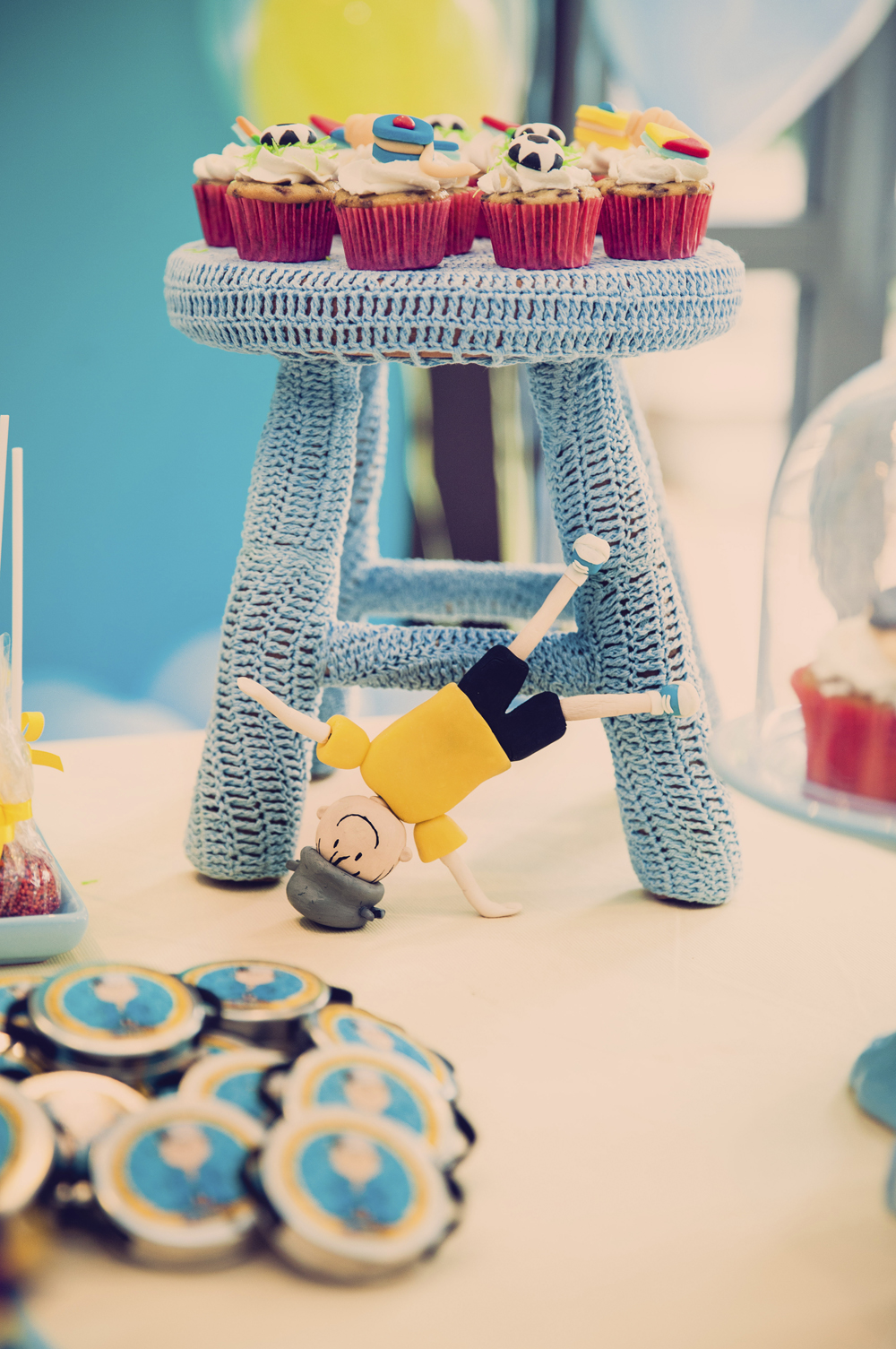 Todos os brinquedos foram especialmente selecionados para a idade dos convidados e as cores foram pensadas para combinar com a festa.